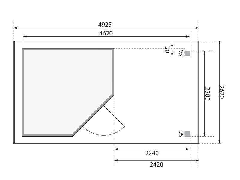 Technische Details Gartenhaus Schwandorf 5 mit Anbaudach 2,25 Meter, Seiten- und Rückwand: