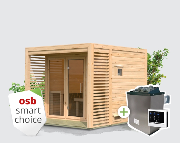 Osb smart choice Saunahaus Patio 3, 38 mm naturbelassen -inkl. 9 kW Ofen ext. Steuerung- inkl. Dacheindeckung und Fußboden